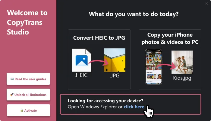 - Step 2: Connect your iPhone or iPad to your PC, then double-click on the CopyTrans Studio icon on your desktop. The welcome window will open. Click on the “Open” button to open your device.